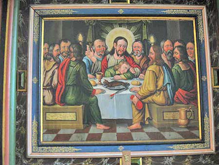 the Last Supper! Who is resting in his knee looking like he had a bit too much of the good wine from the calice and what kind of little strange animal is it on the plate ready to be devoured?